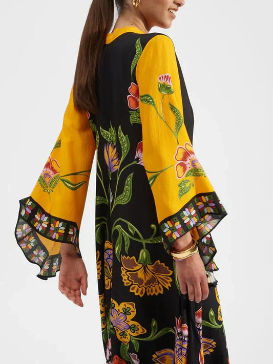 Flattering V-Neckline Unique Printed V Tie Ring Maxi Dress